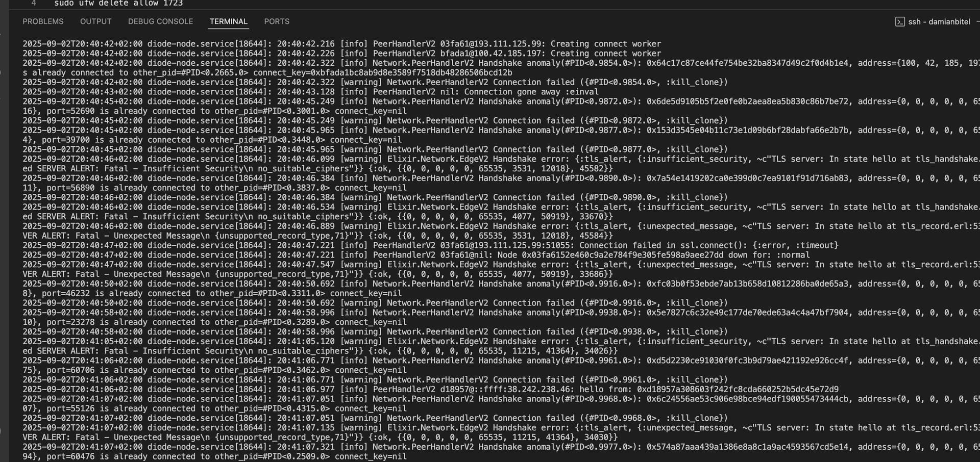 I’m trying to set up a Lite Node on my Raspberry Pi (arm64, fresh Raspberry Pi OS install) following the official guide (snap install diode-node). The node service starts fine, connects to peers, sets the accountant address, and runs without crashes (logs show hello from seeds, cron tasks, etc.). However, the diode-node.info command always crashes with “Can’t set long node name!” and Erlang errors.